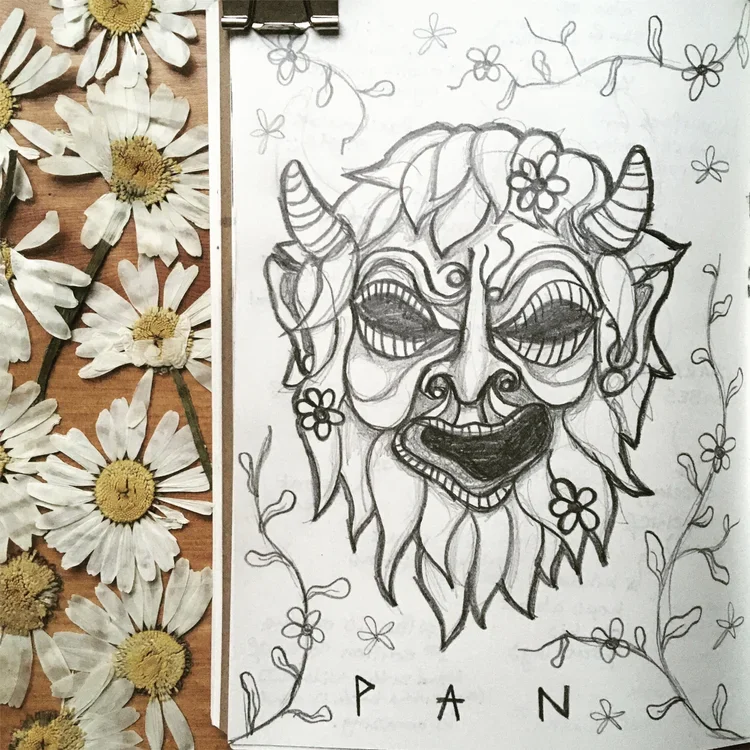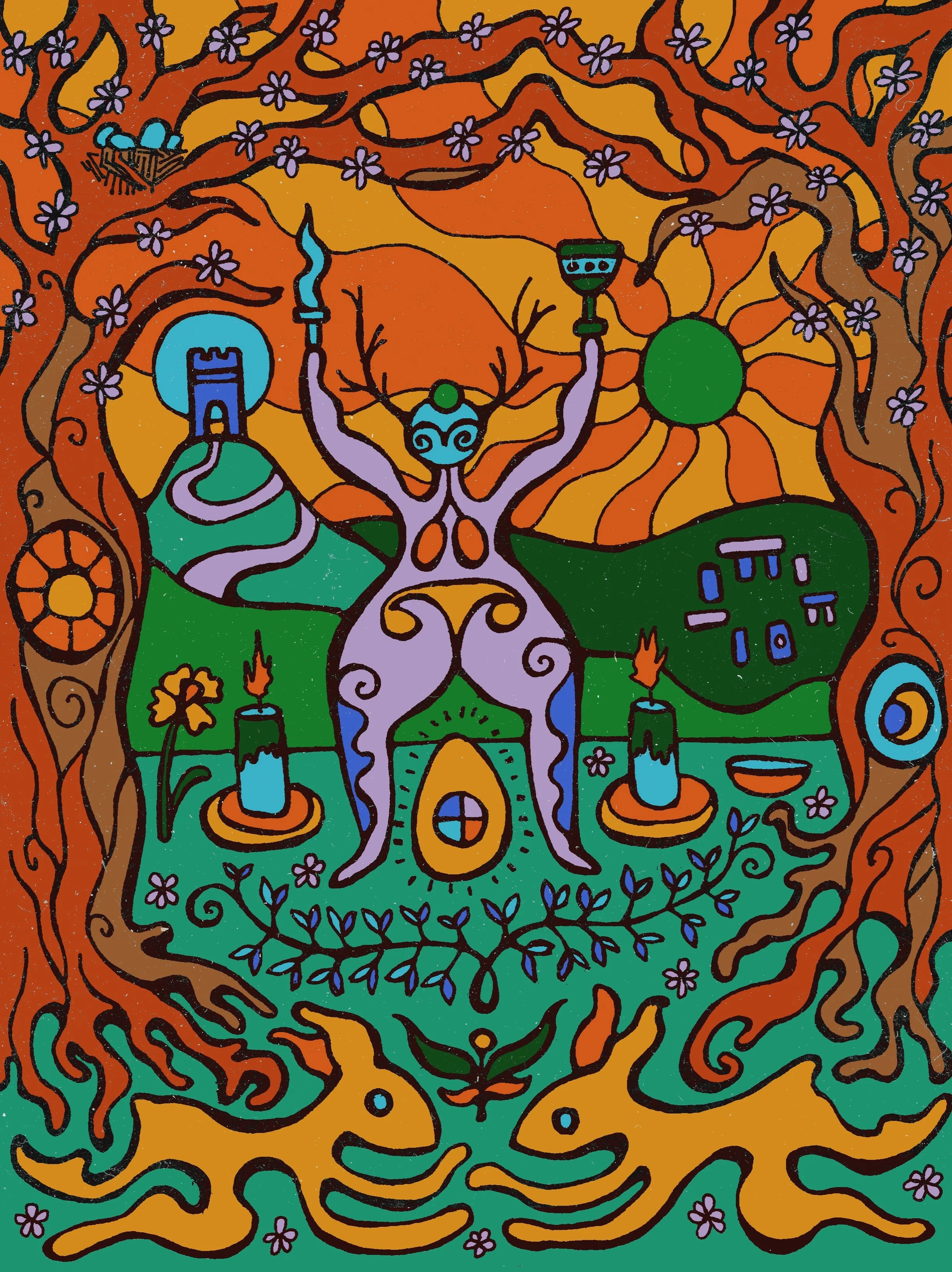 I love the simplicity and magic of creating with pen and ink, but enjoy manipulating my analogue imagery using various digital processes to deepen my psychedelic imagery aesthetic, often combining photography or textures from my travels in mixed media results. I also enjoy gouache and watercolour paint or print making as well as clay or embroidery to craft tactile, 3D worlds.